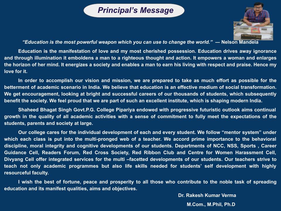 undertaken by the Department Of Higher Education, Government Of Madhya Pradesh and was christened as government college Pipariya.